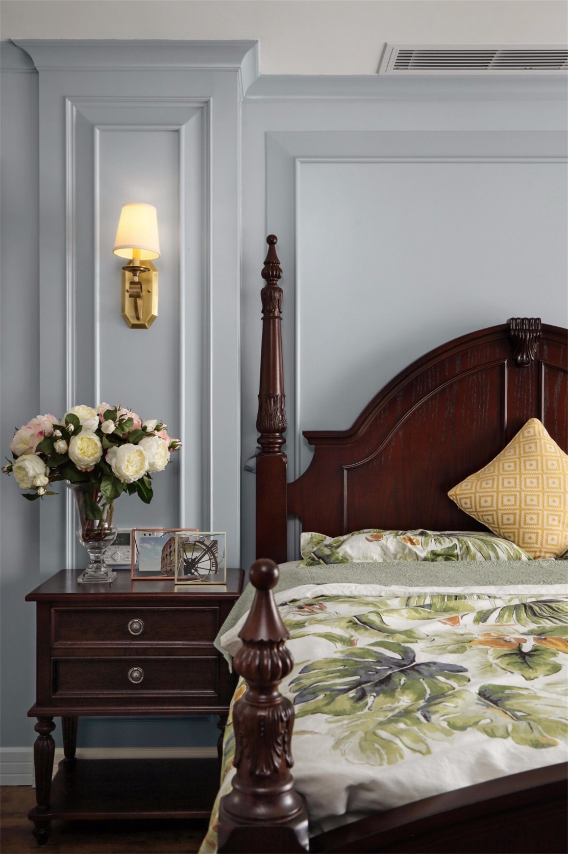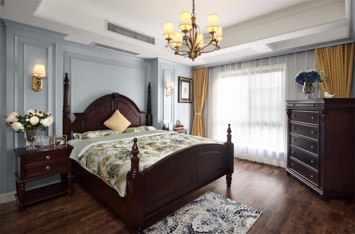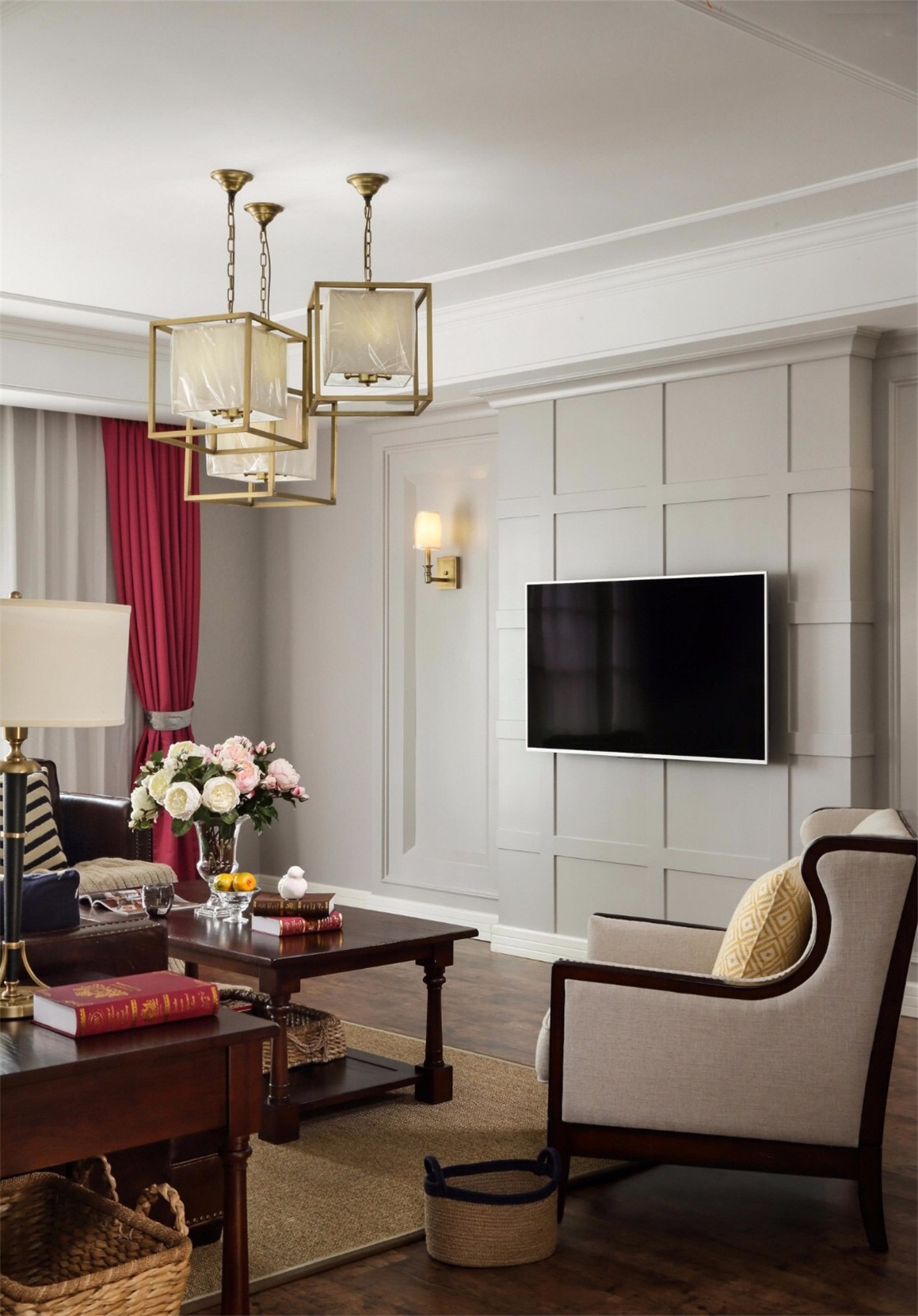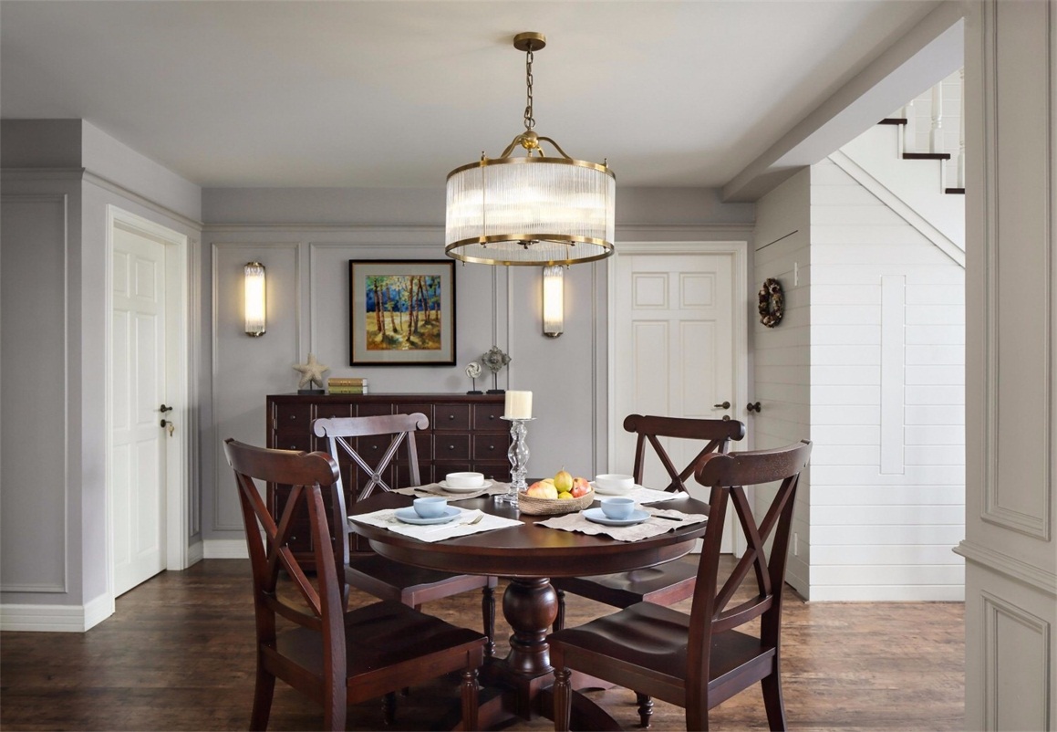 木地板、不銹鋼線條、定制實木護墻板、乳膠漆。